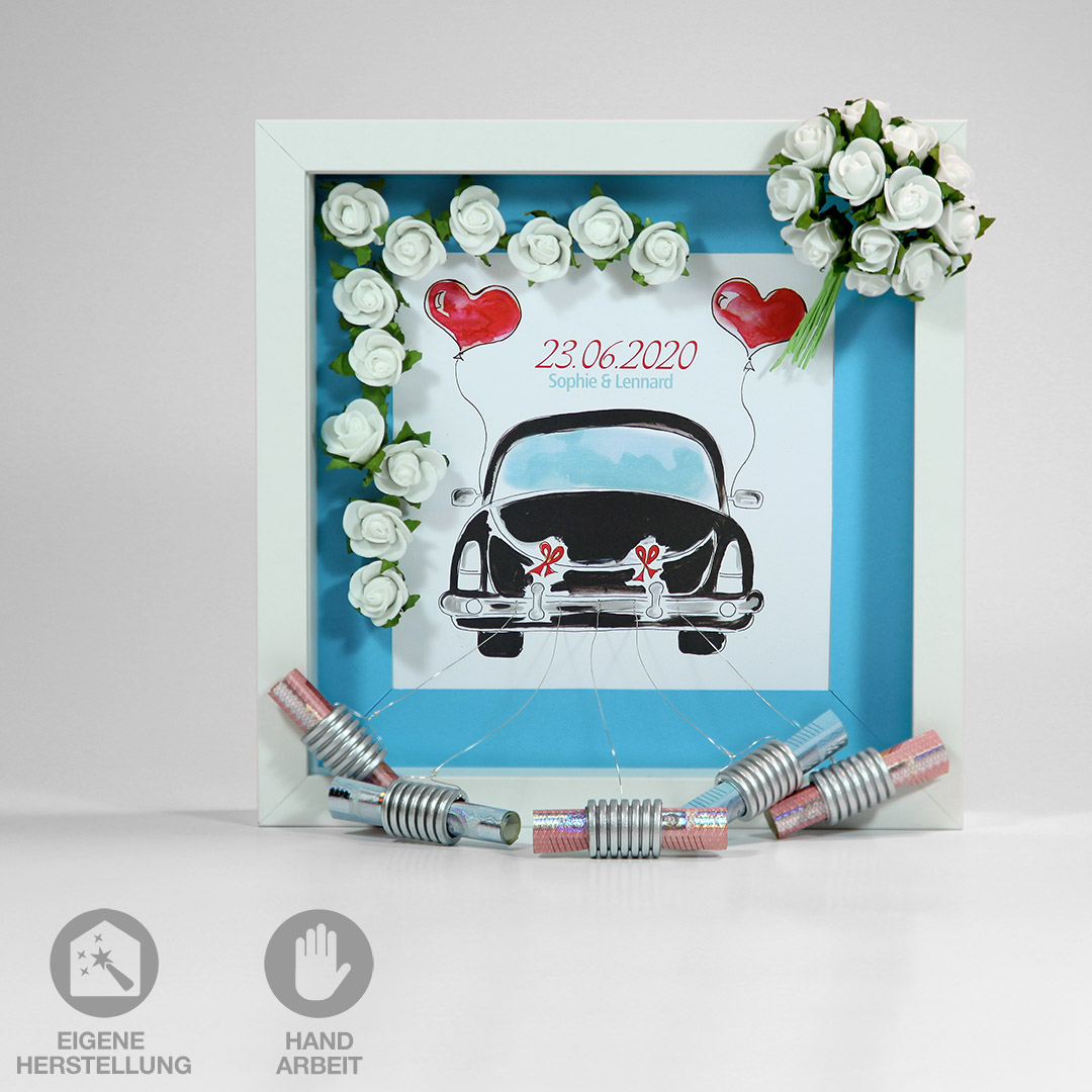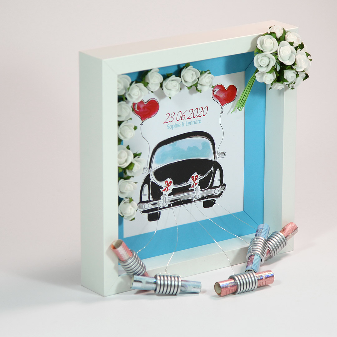 Von einem hellblauen Passepartout, besetzt mit weißen Rosen, hebt sich unser schwarzer, klassischer Oldtimer wunderbar ab. Weiter ist dieser mit roten Schleifen und knallroten, fliegenden Herz-Luftballons geschmückt. Mittig zwischen den Luftballons setzen wir in selbiger Farbe das Hochzeitsdatum. Darunter zieren die Namen der frisch Vermählten diesen prächtigen Hochzeits-Rahmen. Im rechten oberen Bereich des Geschenk-Rahmens präsentiert sich ein Brautstrauß, ebenfalls aus weißen Rosen. An der Stoßstange des schwarzen Oldtimers sind silberne „Blechdosen“ befestigt. Diese hängen an dünnen silbernen Drähten aus unserm Geschenk-Rahmen heraus. Sie eignen sich perfekt für Ihre persönlichen Glückwünsche, und um einen gerollten Hochzeits-Zuschuss zu platzieren.
