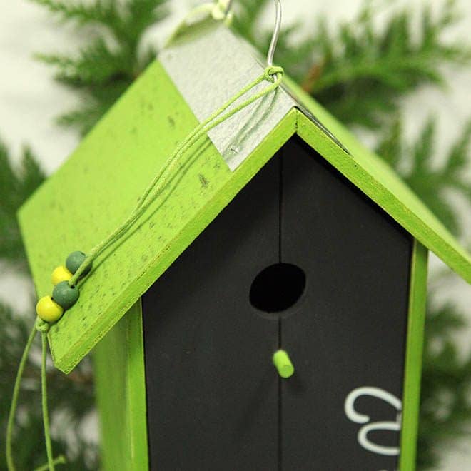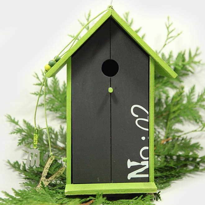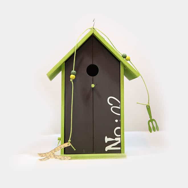 Stylisches Vogelhaus (18cm x 25cm x 15,5cm) aus Holz in grün und anthrazit mit der angeschnittenen Aufschrift „No. 02“. Am Dachfirst ist ein dekoratives Blech angebracht, an dessen Aufhängung grüne, schmückende Holzperlen und kleine Garten-Werzeuge aus Holz aufgefädelt sind. Unter dem Eingangs-Loch befindet sich eine kleine Stange. Das Vogelhaus ist wie eine Schublade aufzuziehen, seitlich muss man allerdings zuerst einen kleinen Verschluss öffnen. Für jeden Piepmatz einen Anflug wert!